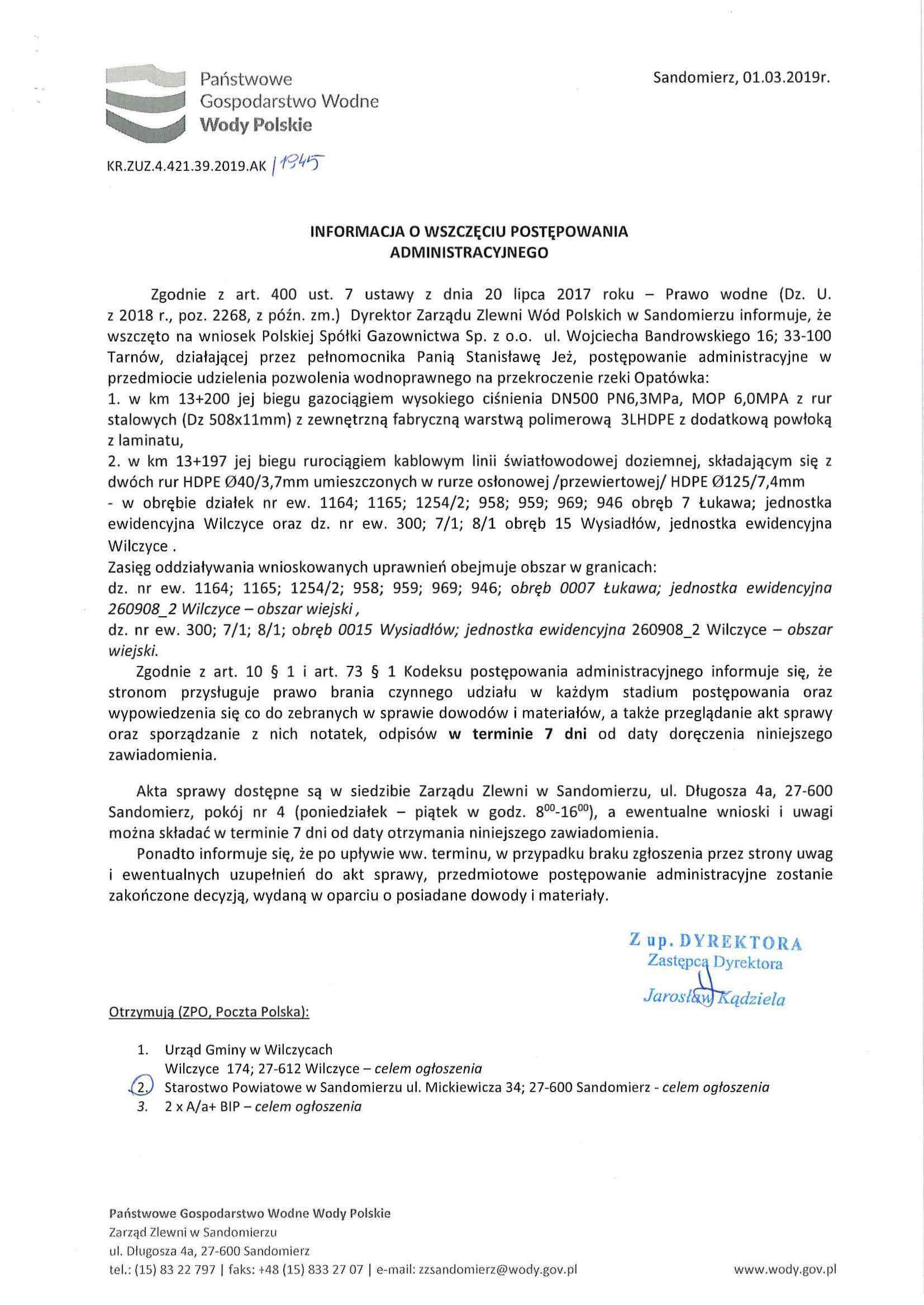 | Informacja KR.ZUZ.4.421.39.2019.AK z dnia 01.03.2019 r. o wszczęciu postępowania administracyjnego w przedmiocie udzielenia pozwolenia wodnoprawnego na przekroczenie rzeki Opatówka. |