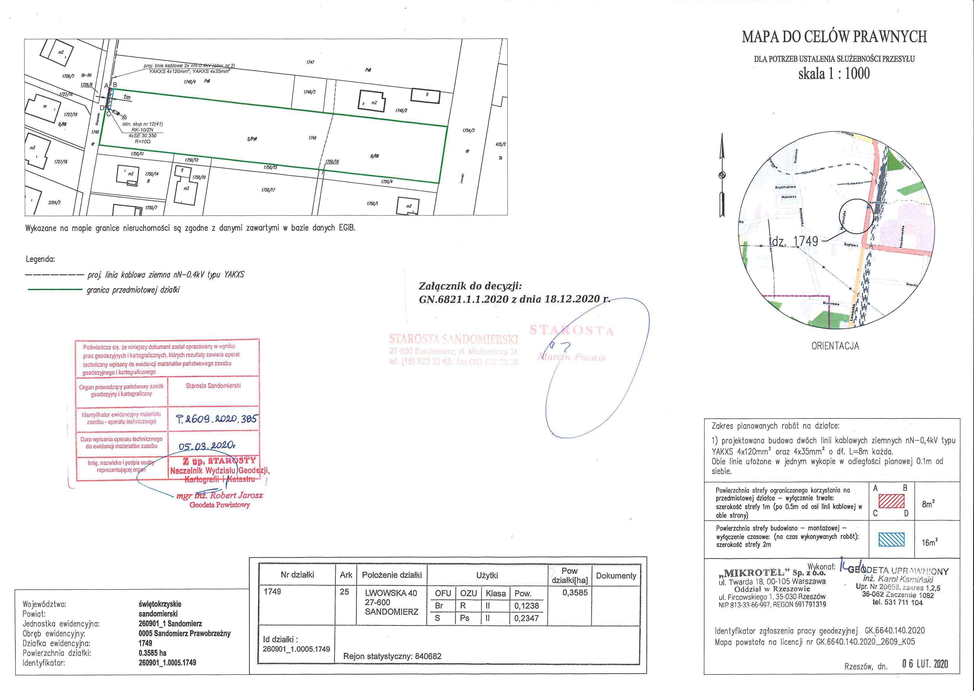 1. Ograniczyć sposób korzystania z nieruchomości gruntowej o nieuregulowanym stanie prawnym, położonej w Sandomierzu obręb Sandomierz Prawobrzeżny, oznaczonej w ewidencji gruntów numerem działki 1749 o powierzchni 0,3585 ha, poprzez udzielenie zezwolenia na przeprowadzenie przez nieruchomość linii kablowych ziemnych nN w ramach realizacji inwestycji celu publicznego pn.: „Budowa sieci elektroenergetycznej i budowa stacji transformatorowej wraz z nawiązaniami SN i nN wykonanie rozcięć w istniejących liniach nN oraz demontażu istniejącej stacji transformatorowej w miejscowości Sandomierz ul. Lwowska”, zgodnie z ustaleniami decyzji Burmistrza Miasta Sandomierza o ustaleniu lokalizacji inwestycji celu publicznego z dnia 28 stycznia 2020 r. znak: UA.6733.18.2019.MSZ. 2. Ustanowić pas strefy kontrolowanej linii elektroenergetycznej na czas jej eksploatacji o szerokości 1.00 m, po 0,50 m od osi linii jako trwałe ograniczenie praw rzeczowych na nieruchomości objętej wnioskiem. 3. Zobowiązać każdorazowego właściciela nieruchomości – do jej udostępnienia w celu wykonania czynności związanych z założeniem, a następnie z konserwacją oraz usuwaniem awarii przewodów i urządzeń. 4. Zobowiązać PGE Dystrybucja S.A. do przywrócenia nieruchomości do stanu poprzedniego niezwłocznie po zakończeniu robót.Jeżeli przywrócenie nieruchomości do stanu poprzedniego stanie się niemożliwe albo powoduje nadmierne trudności lub koszty, bądź na skutek zrealizowania inwestycji zmniejszy się wartość nieruchomości, w odrębnej decyzji ustalone zostanie odszkodowanie za wynikłe z tego tytułu szkody. 5. Ostateczna decyzja o ograniczeniu sposobu korzystania z nieruchomości stanowić będzie podstawę do dokonania wpisów w księdze wieczystej. Wpisu dokonuje się na wniosek starosty wykonującego zadania z zakresu administracji rządowej. Uzasadnienie W dniu 4 lutego 2020 roku PGE Dystrybucja S.A. reprezentowana przez pełnomocnika Pana Marka Palucha zwróciła się do Starosty Sandomierskiego z wnioskiem o wydanie decyzji w trybie art. 124a ustawy z dnia 21 sierpnia 1997 roku o gospodarce nieruchomościami, ograniczenia sposobu korzystania z nieruchomości o nieuregulowanym stanie prawnym, położonej w Sandomierzu obręb Sandomierz Prawobrzeżny, oznaczonej w ewidencji gruntów numerem działki 1749 o powierzchni o powierzchni 0,3585 ha, poprzez udzielenie zezwolenia na założenie i przeprowadzenie przez nieruchomość dwóch linii kablowych nN, ułożonych w jednym wykopie w odległości poziomej 0,1 m od siebie na długości 8 m, w ramach realizacji inwestycji celu publicznego pn.: „Budowa stacji transformatorowej 15/0,4 kV wraz z nawiązaniami SN i nN wykonanie rozcięć w istniejących liniach nN oraz demontażu istniejącej stacji transformatorowej w miejscowości Sandomierz ul. Lwowska”. Zgodnie z art. 2 pkt 5 ustawy z dnia 27 marca 2003 roku o planowaniu i zagospodarowaniu przestrzennym (Dz. U. z 2020 roku poz. 293 z późn. zm.) oraz z art. 6 pkt. 2 ustawy z dnia 21 sierpnia 1997 roku o gospodarce nieruchomościami tj. „budowa i utrzymywanie ciągów drenażowych, przewodów i urządzeń służących do przesyłania płynów, pary, gazów i energii elektrycznej, a także innych obiektów i urządzeń niezbędnych do korzystania z tych przewodów i urządzeń” stanowi cel publiczny. Przebieg trasy projektowanego gazociągu na nieruchomości jest zgodny z ustaleniami decyzji Burmistrza Miasta Sandomierza o ustaleniu lokalizacji inwestycji celu publicznego z dnia 28 stycznia 2020 r. znak: UA.6733.18.2019.MSZ. Projektowany linia nN ma na celu poprawe warunków napięciowych na tym terenie, jest to konieczne dla ochrony interesu publicznego. Planowana inwestycja ma charakter ponadlokalny Trasa projektowanej linii została przeprowadzona po przeprowadzeniu dokładnej wizji lokalnej przez projektanta działającego w ramach przedmiotowego zamierzenia w imieniu i na rzecz wnioskodawcy. Linia została zlokalizowana przy uwzględnieniu aktualnych warunków terenowych, obowiązujących przepisów prawa oraz uwarunkowań ewidencyjnych i urbanistycznych. Trasa linii zaprojektowana została tak, aby jak najmniej ingerować Przebieg projektowanej linii nN przez nieruchomość oznaczoną działką nr 1749 w Sandomierzu uwzględnia zróżnicowane wysokościowo ukształtowanie terenu, jednocześnie zachowując obowiązujące standardy PGE Dystrybucja S.A. w zakresie bezpieczeństwa użytkowania i eksploatacji. Zajęcie części nieruchomości stanowiącej działkę nr 1749 położoną w Sandomierzu polegać będzie na wykonaniu prac związanych z przeprowadzeniem dwóch linii kablowych nN-0,4 kV typu YAKXS 4 x 120 mm2, oraz typu YAKXS 4 x 35 mm2 ułożonych w jednym wykopie w odległości poziomej 0,1 m od siebie na długości 8 m wzdłuż granicy działki w pasie 4m tj. w pasie wyłączonym spod zabudowy. Powierzchnia pasa strefy kontrolowanej linii kablowej jako trwałe ograniczenie wynosi 8 m2. W obrębie strefy kontrolowanej linii kablowej nie należy wznosić obiektów budowlanych, urządzać stałych składów i magazynów oraz podejmować działań mogących spowodować uszkodzenia gazociągu podczas jego użytkowania. Przewiduje się, iż na okres budowy linii kablowej zostanie zajęty pas montażowy o szerokości 2,0 m wzdłuż osi projektowanego linii umożliwiający prowadzenie robót ziemnych i montażowych. Powyższym wnioskiem objęto działkę nr 1749 o powierzchni 0,3585 ha położoną w Sandomierzu obręb Sandomierz Prawobrzeżny. Dla nieruchomości nie ma założonej księgi wieczystej ani urządzonego zbioru dokumentów. Nieruchomość nie posiada uregulowanego stanu prawnego. Ogłoszenie o zamiarze ograniczenia sposobu korzystania z nieruchomości podane zostało do publicznej wiadomości w dniu 19 czerwca 2020 roku poprzez zamieszczenie w ogólnopolskim wydaniu serwisu „Monitor Urzędowy”, na stronie internetowej Starostwa Powiatowego
